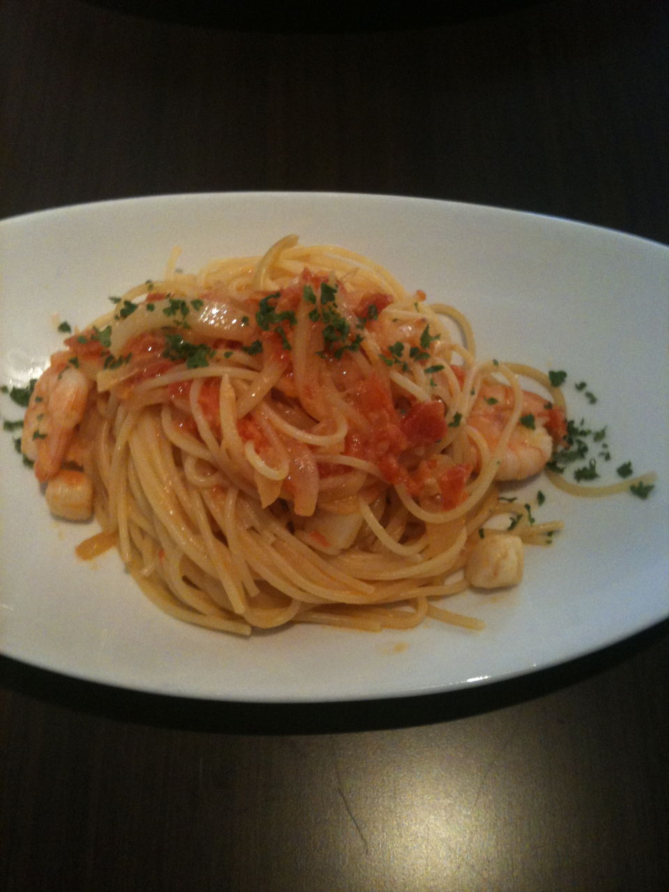 今日は小エビと貝柱のトマトクリームソースです(。・ω・)ノ゙