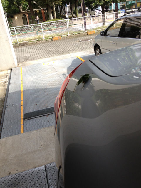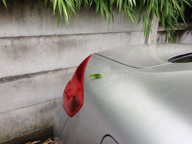 仕事から帰ろうとすると、車にバッタがいました… けっこうな大きさです…