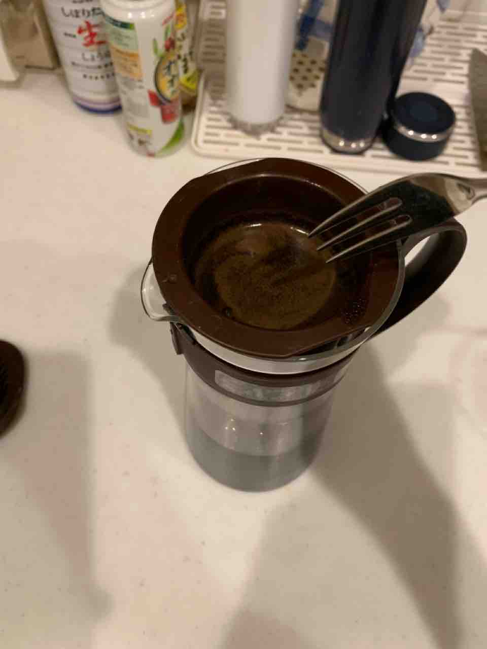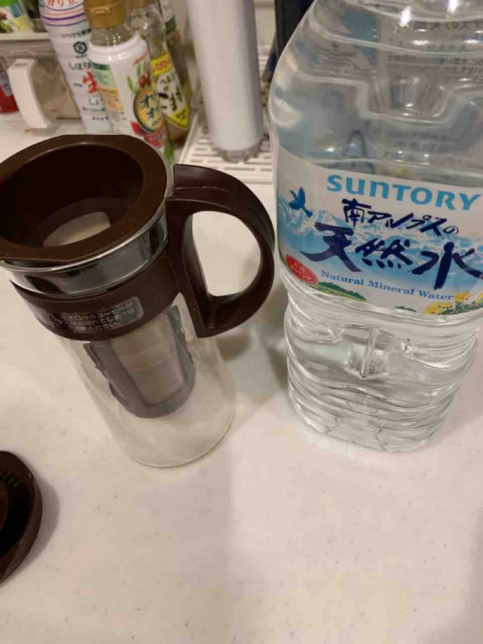 挽いた豆を水出し用のポットに移してミネラルウォーターを入れていきます。