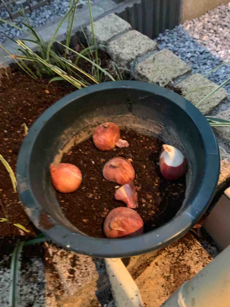 鉢に土を入れて、球根の背中を外側に向けて入れました。
