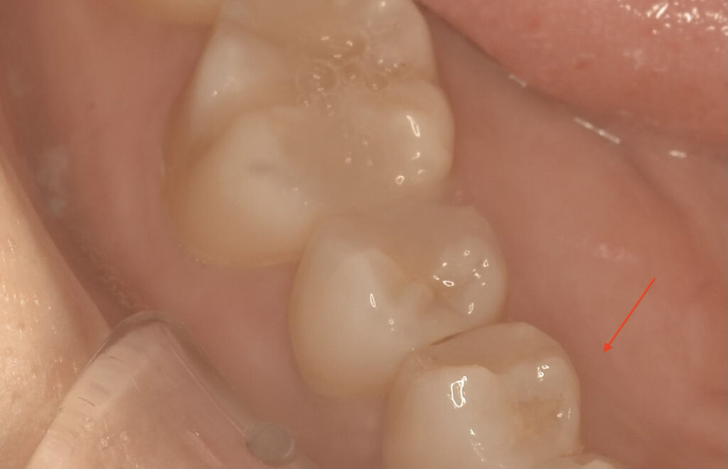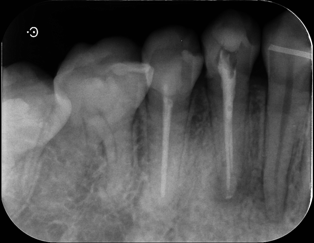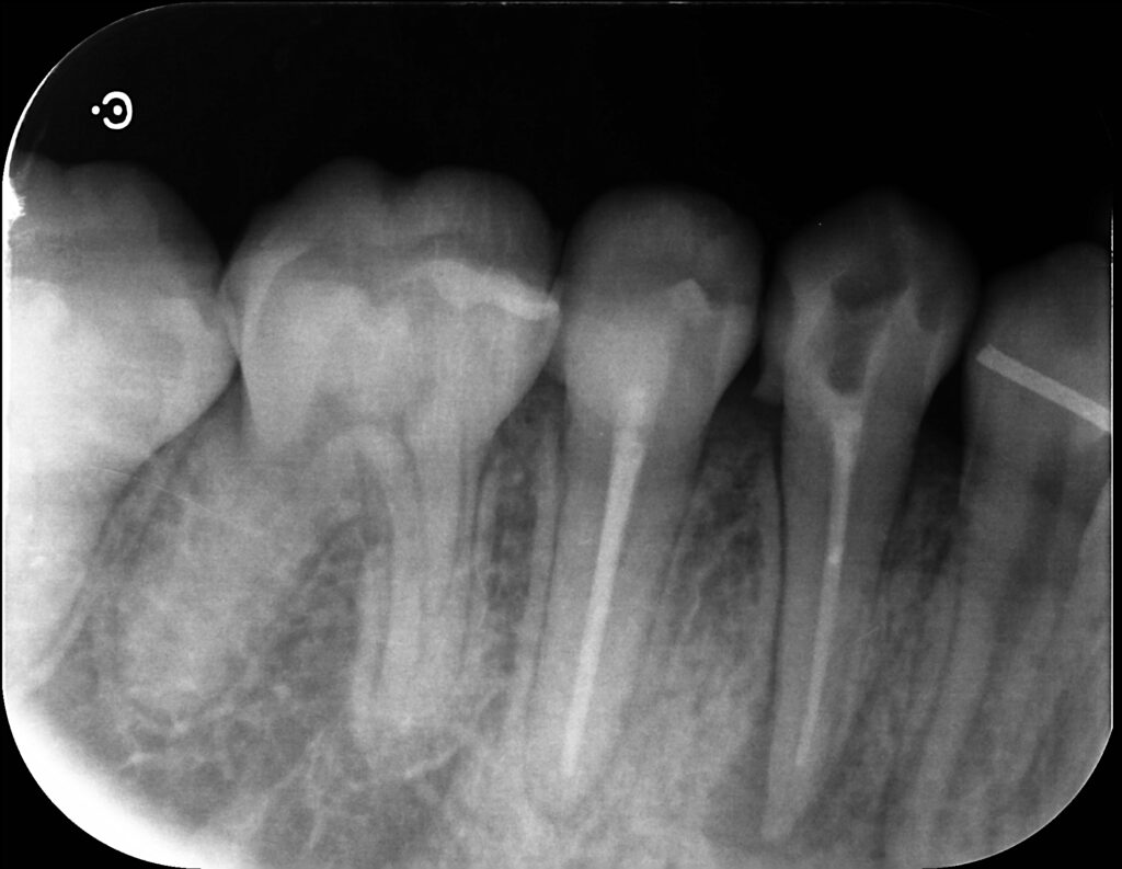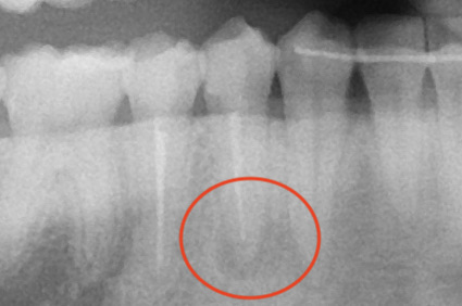 右下4番の根尖部に黒い透過像がありますね。(赤丸で囲ったところ)