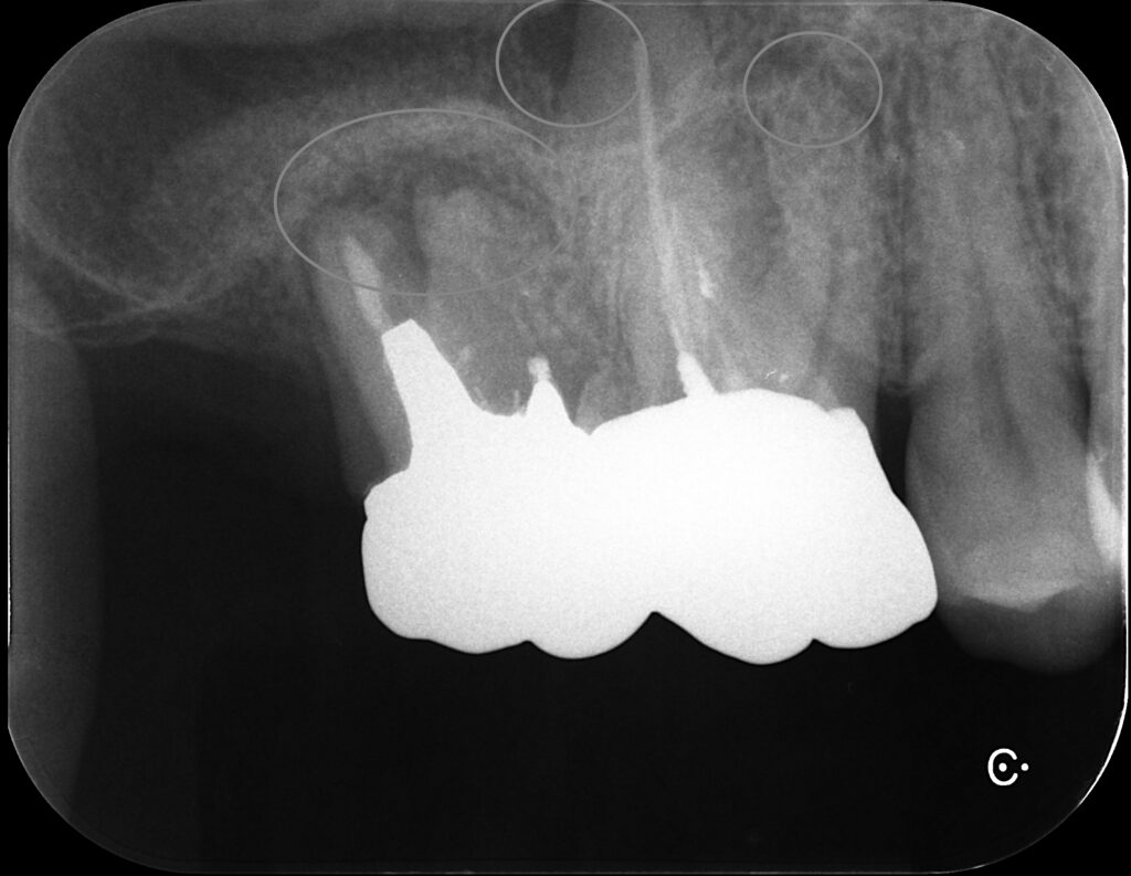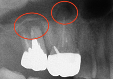赤丸の部分。根尖病巣によって黒くなっており、骨が溶けていて炎症が見られます。