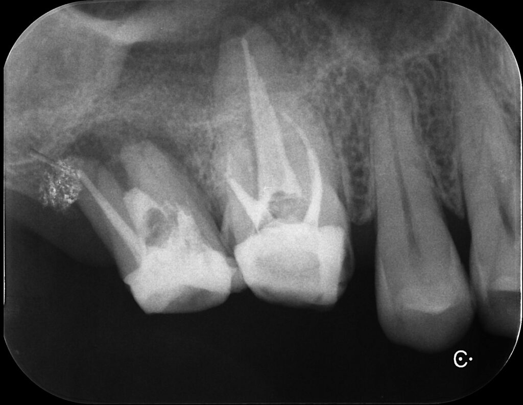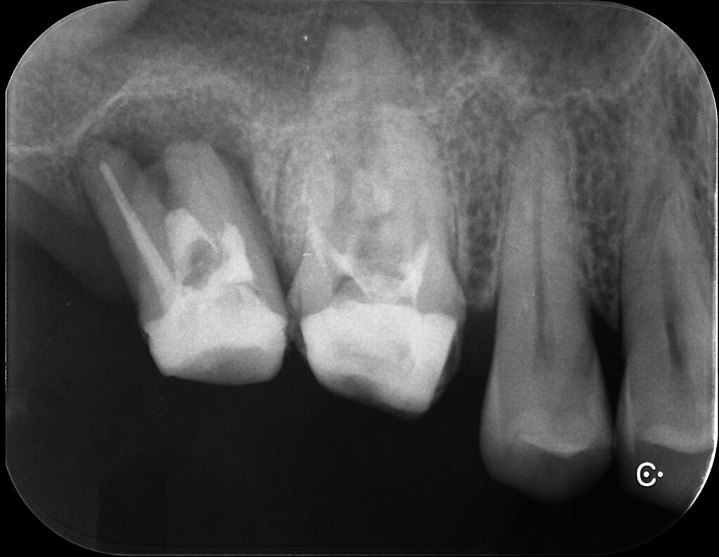 クラウンを除去、何回か根管を洗浄し様子を見ます。