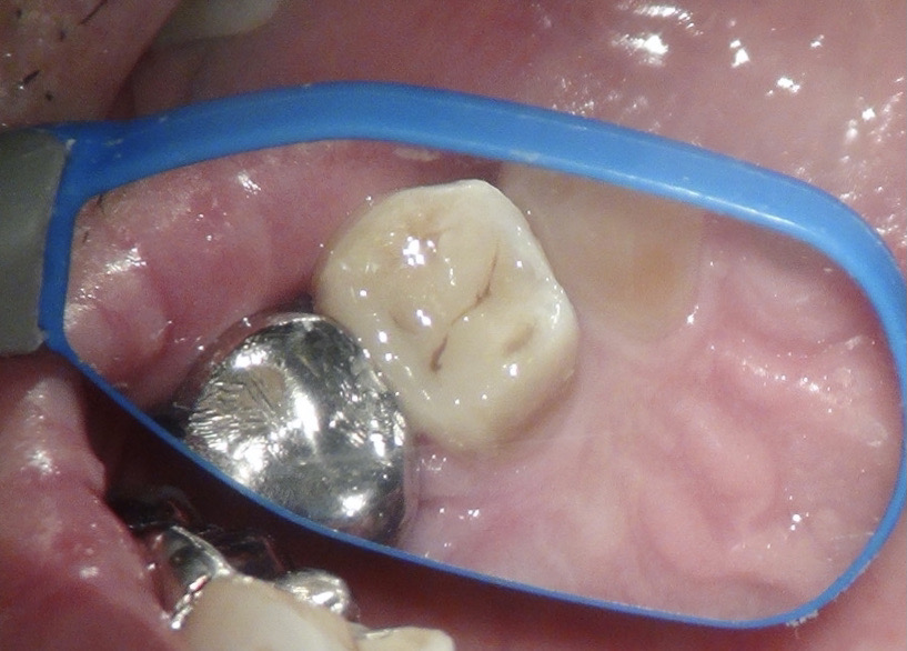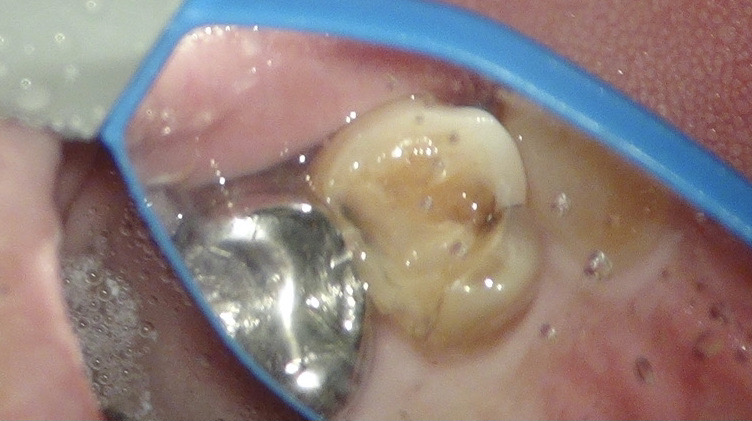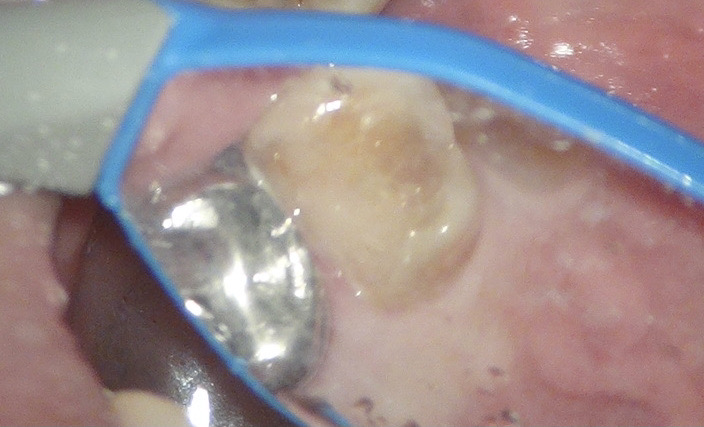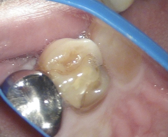 痛みはないが、歯に亀裂があるのと、古いレジンの隙間からむし歯になってしまっていました。